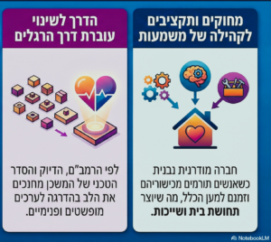 כלומר, לא ניתן לשנות תודעה אנושית בבת אחת. בני אדם זקוקים לתהליך. לכן, התורה לא ביטלה לחלוטין את עולם הפולחן שהיה מוכר אז, אלא כיוונה אותו למקום אחר. המשכן, אם כן, איננו רק מבנה- הוא כלי חינוכי. דרך הדיוק, הסדר והמעשה החיצוני, הלב לומד בהדרגה לכוון למופשט, לערכי ולפנימי. כך המבנה החיצוני מחנך את האדם מבפנים- רעיון שמדבר גם אלינו: לפעמים איננו משתנים בקפיצה, אלא דרך הרגלים קטנים, מסגרות וסדר שמכוונים ומדייקים את הלב לאט וביציבות.