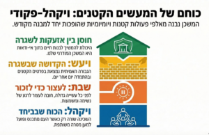 רעיון זה מתחדד באמצעות מוטיב החוזר שוב ושוב בפרשת פקודי: “כַּאֲשֶׁר צִוָּה ה׳ אֶת מֹשֶׁה”. הביטוי הזה מופיע פעמים רבות לאורך הפרשה ומדגיש כי הגדולה של הבונים איננה דווקא ביצירתיות יוצאת דופן, אלא בנאמנות ובעקביות- ביכולת לבצע שוב ושוב את אותה משימה בדיוק כפי שנדרשה. כך מסתיים ספר שמות במסר מפתיע: הקדושה אינה שייכת רק לרגעי שיא של התגלות ונס, אלא נבנית גם בתוך העבודה השקטה, בפרטים הקטנים וביכולת להתמיד יום אחר יום. וכאן, הרעיון העתיק הזה פוגש את החיים שלנו בצורה כמעט ישירה. יש תקופות שבהן החיים עצמם מרגישים כמו אותה רשימת “ויעש” אינסופית, שרשרת של פעולות קטנות ושוחקות: כביסה אינסופית, הכנת ארוחות למשפחה, ניקיונות, ריצה בין עבודה, בית, לימודים ועוד. ובמציאות הישראלית של התקופה האחרונה- "ויעש" גם בין התראות, אזעקות, חדשות ומתח מתמשך. בתוך כל האי־ודאות, לעיתים כל מה שאפשר לעשות הוא פשוט להחזיק את הרגע ולנסות לשמור על שגרה.